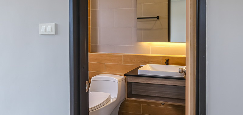ห้องน้ำบ้านหนองจอก เป็นงานสเปก STANDARD จะใช้บ่าเป็ฯกระเบื้อง มีการออกแบบยึด theme ความอบอุ่น ผสมลายกระเบื้องลายไม้ผสมกระเบื้องสีพื้นสีเทา นอกจากนี้ห้องน้ำส่วนกลางชั้นล่าง เป็นห้องเล็ก แต่มีอ่่างล้างหน้า โถปะสสาวะ และชักโครกครบ โดยใช้ประตูบานเลื่อนเพื่อแก้ปัญหาการเปิดประตู
