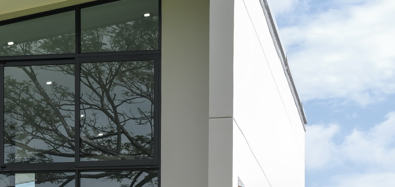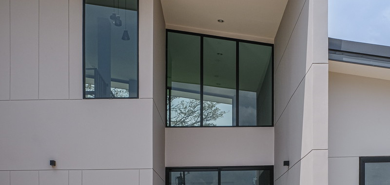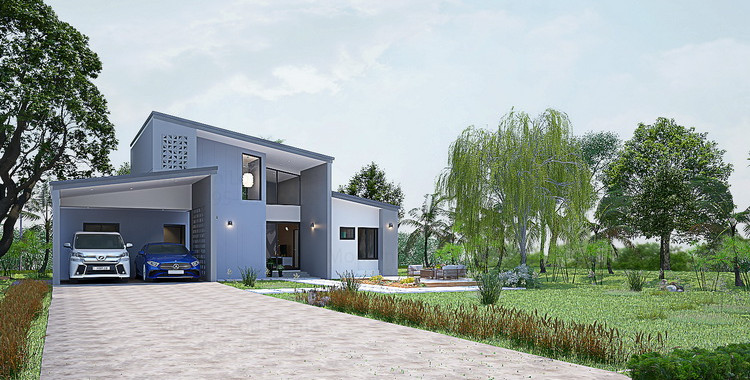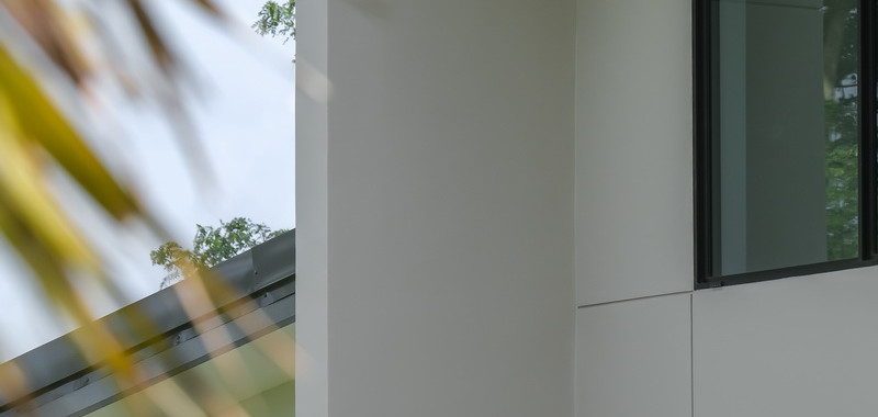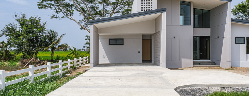 ดีเทลด้านนอกของบ้านโมเดิร์นลอฟท์ หนองจอก เน้นความสร้างให้โถงสูงกลางบ้านโดดเด่นเป็นจุดเด่นของบ้าน โดยจะมีการสร้างแผงยื่นเพื่อให้เกิดขอบเขต สร้างมิติให้ช่วงสูงกลางบ้านให้เกิดมิติที่โดเด่น และแผงดังกล่าวยังใช้ประโยชน์ในการสร้างร่มเงาให้บ้าน ทำให้คนที่อยู่ในบ้านใช้ชีวิตได้ ถึงแม้จะมีกระจกโถงสูง ซึ่งมักเป็นข้อจำกัดของบ้านแบบมี DOUBLE VOLUME ที่มักเจอเรื่องแดดแยงเข้า ทำให้ไม่สามารถใช้งานได้จริง