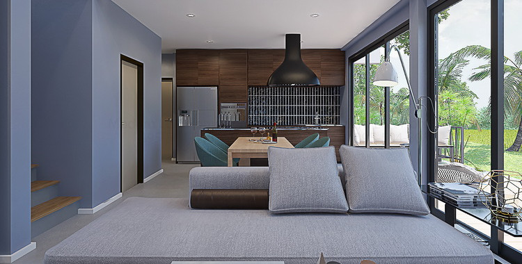1.1) ส่วนกลางบ้าน เป็น open plan ประกอบด้วย ส่วนนั่งเล่น, ทานอาหาร, แพนทรี่ (ไม่มีครัวไทย), ห้องน้ำเล็กส่วนกลาง