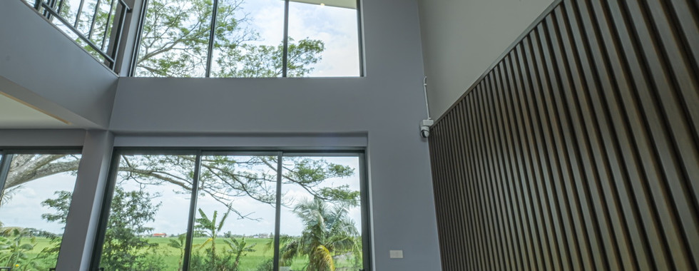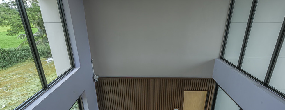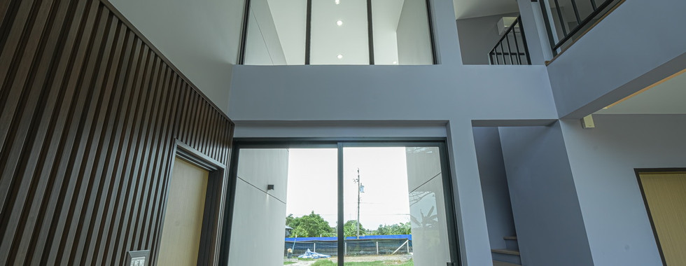 ความตั้งใจแรกของเจ้าของบ้านที่ต้องการให้บ้านหลังนี้เป็น คือบ้านต้องมีโถง double volume เพื่อสร้างความพิเศษให้บ้านที่ขนาดไม่ได้ใหญ่มากนัก โดยเราออกแบบให้เมื่อเจ้าของบ้านขึ้นบันไดจากขั้นล่างพื้นที่อเนกประสงค์ที่ชั้นสอง พร้อมสามารถมองจากโถงลงไปเห็นส่วนนั่งเล่นที่ชั้นล่าง และมีหน้าต่างบ้านใหญ่ ที่เปิดมุมมองไปยังด้านนอก ทำให้ดกิดการเชื่อมต่อของ SPACE โถงภายในต่อเนื่องไปยังโถงภายนอก เกิดความต่อเนื่องได้อย่างไม่เคอะเขิน