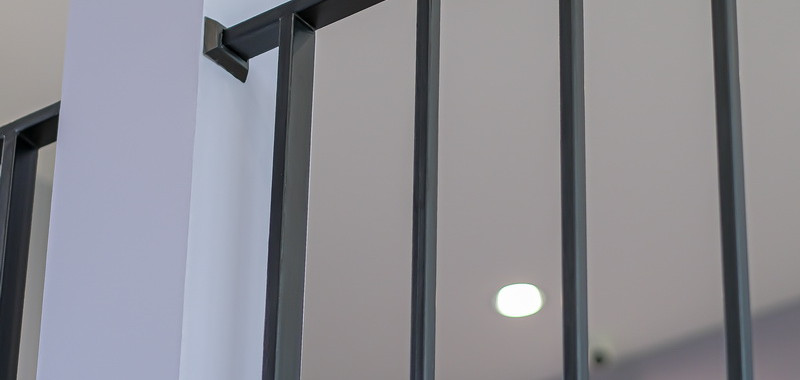 บันไดของบ้านโมเดิร์นลอฟท์ หนองจอก เราออกแบบให้เป็นบันไดแบบมีชานพัก หัก90องศา เดินต่อเนื่องขึ้นไปโถงชั้นบน โถงเนื่องด้วยสเปกงานเป็น STANDARD จึงไม่มีไม้ลูกตั้ง ใช้เป็นงานทาสี แต่ลูกนอนเราใช้ไม้เทียมขึ้นรูปปิดผิวด้วย SPC ทำให้มีความคล้ายกับงานไม้จริง นอกจากนี้บันไดมีไฟห้อยโถงสร้างจุดสนใจได้ทั้งขณะขึ้นบันได และแม้แต่ขณะทำกิจกรรณชั้นล่างหรือชั้นบน