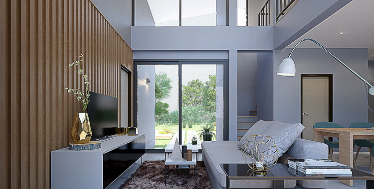 1.2) โถงโล่ง Double Volume ออกแบบพิเศษ ทำให้ส่วนนั่งเล่นมีเพดานสูงโล่ง